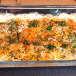 - Escampau la salsa per damunt del peix, abocau la llet que pràcticament tapi el peix i enfornau a 180º.